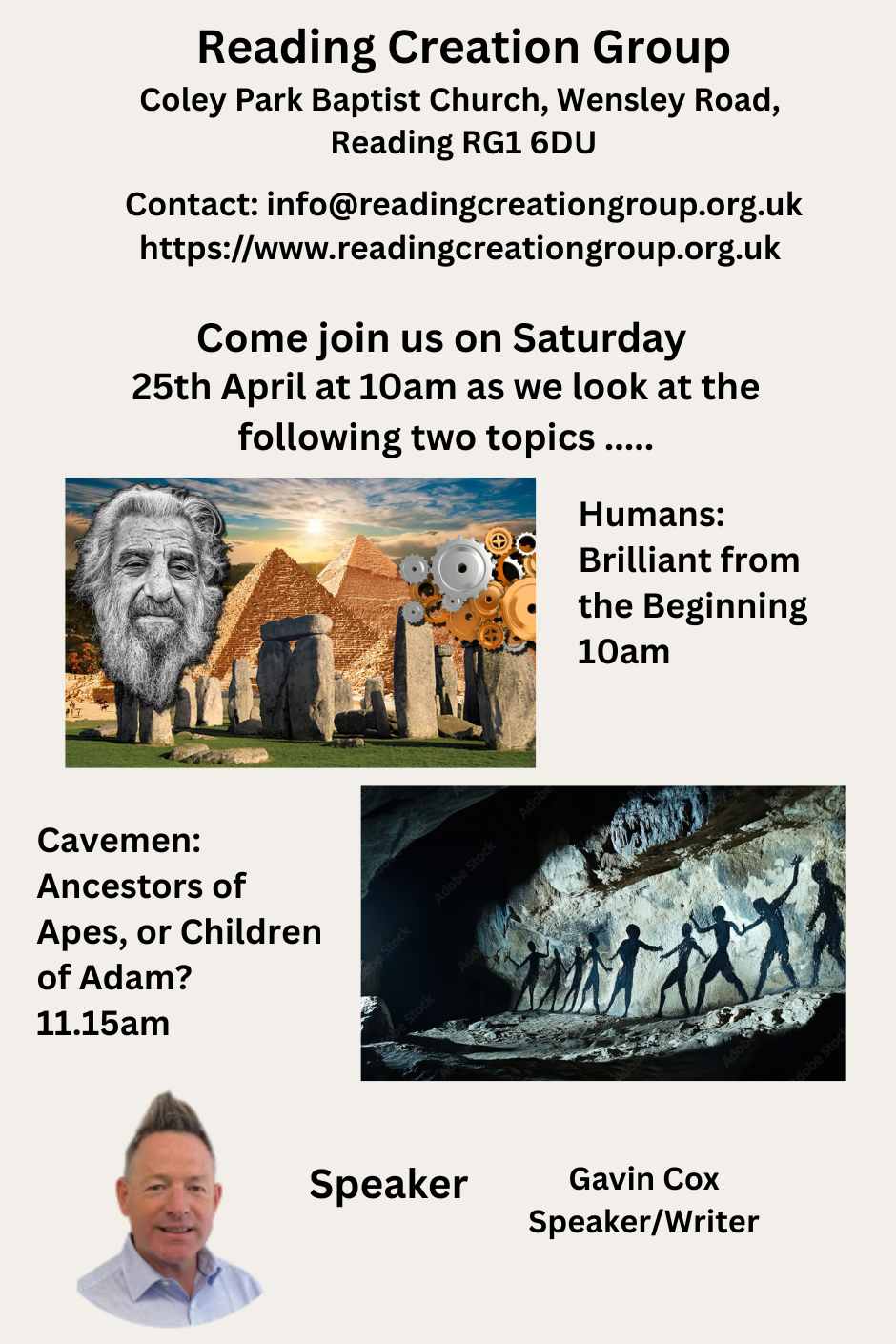 Speaker for both of theses talks is Gavin Cox. Previously a speaker and writer for Answers in Genesis.